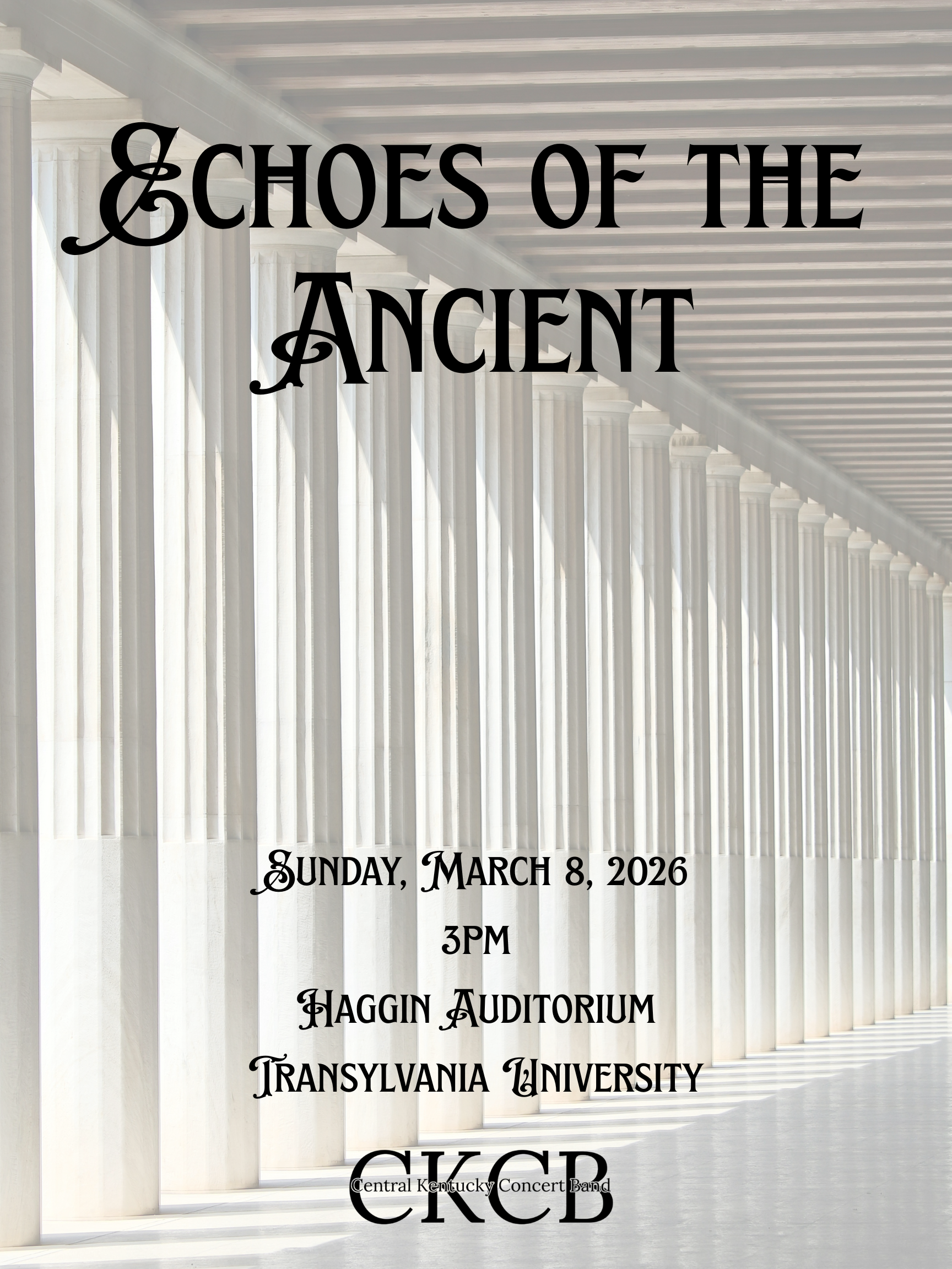 Join the Central Kentucky Concert Band on Sunday, March 8 @ 3pm at Transylvania University’s Haggin Auditorium for our FREE concert, Echos of the Ancient, featuring music by Wagner, Higgins, Joio, and Colgrass.