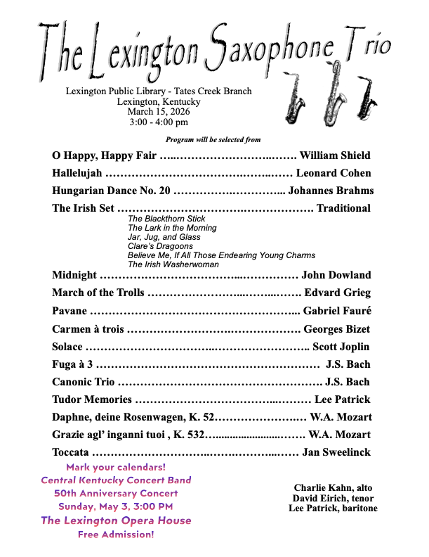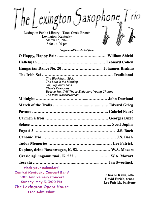 Three members of the CKCB saxophone section will pop-up at a local library branch, as part of the band’s celebration of its fiftieth year. The performance will commence at 3:00.