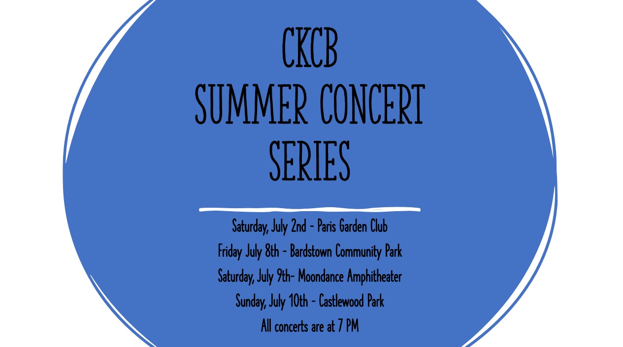 Come join us for some wonderful music this summer in the outdoors! Kicking it off on July 2nd, we will be playing at the Paris Garden Club. The next weekend we’ll start at Bardstown Community Park Farmers Market (111 E Flaget) on July 8th. On the 9th we’ll be playing at Moondance Amphitheater. Our last performance for the summer will be at Castlewood Park on July 10th. All concerts are free and will start at 7 PM. Bring a chair or a blanket and enjoy this event! We hope to see you there!