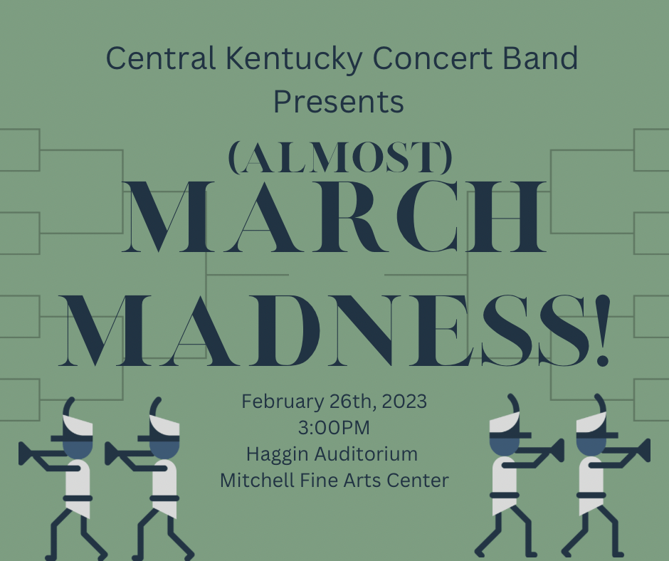 We’re excited to announce our next performance, (Almost) March Madness! The program will consist of a wide array of marches from an eclectic variety of sources: Beethoven, Tchaikovsky, Hindemith, Grainger and of course, Sousa. Mark your calendars for February 26th at 3:00 PM in Haggin Auditorium at Transylvania University. As always, admission is free. We greatly appreciate your continued support of the Central Kentucky Concert Band and look forward to marching with you soon!